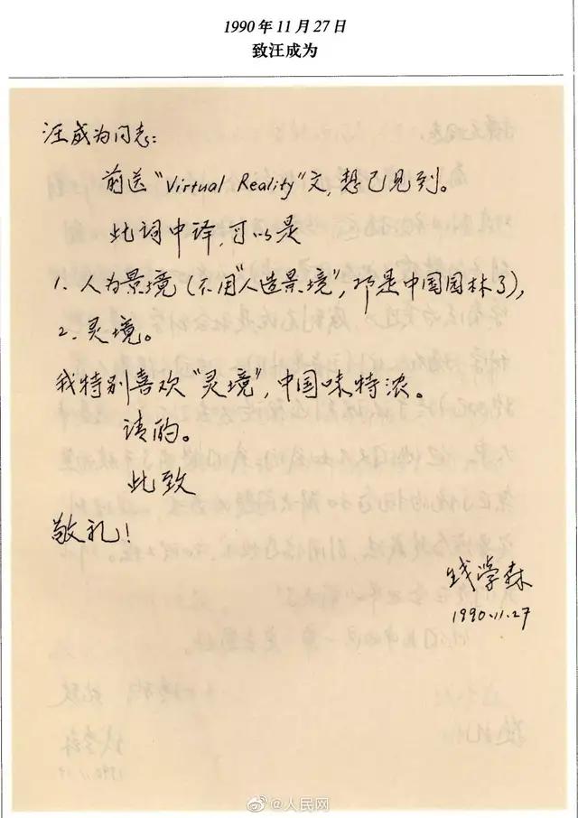 钱学森建议将Virtual Reality的中文翻译为“灵境”,他在信中写道:“我对灵境技术及多媒体的兴趣在于它能大大扩展人脑的知觉,因而使人进入前所未有的新天地,新的历史时代要开始了!”他认为,“灵境技术是继计算机技术革命之后的又一项技术革命。它将引发一系列震撼全世界的变革,一定是人类历史中的大事。”