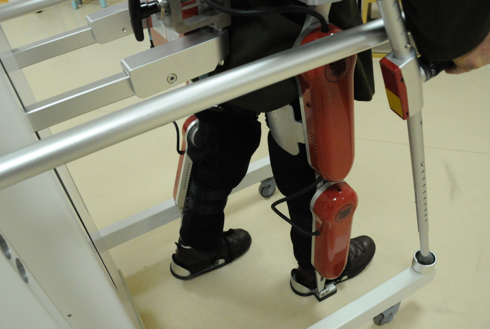 截瘫助行外骨骼机器人的腿部细节。新华社记者 高健钧 摄