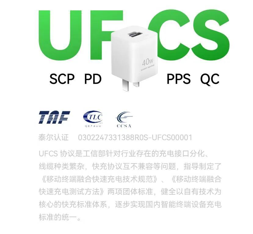 而这个UFCS协议认证由信通院、华为、OPPO、vivo、小米牵头,联合矽力杰、瑞芯微、立辉科技、昂宝电子等多家终端、芯片企业和产业界来共同努力完成对于快充协议的“统一”标准。目前通用最高功率40W,第二阶段会升级到65W。
