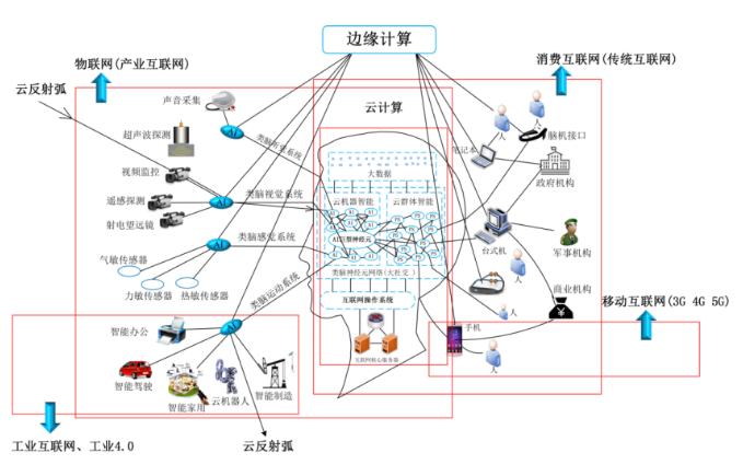 从21 世纪科技发展趋势看,种种迹象表明,经过50年的发展,互联网正从网状结构向类脑模型演化,如腾讯、脸书(Facebook)等社交网络具备的神经网络特征,谷歌街景系统具备的视觉神经特征以及云计算具备的中枢神经特征等。2008年,互联网大脑模型建立,将类脑结构与互联网结合形成了互联网的未来架构(如图1所示)。