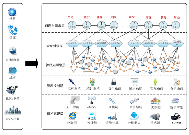 在“1+2+N”建设模式的基础上,可以进一步形成数字大脑的数字科技建设架构(如图3所示),它由五个功能层次组成,分别是问题与需求层、云反射弧层、神经元网络层、管理控制层、技术支撑层。