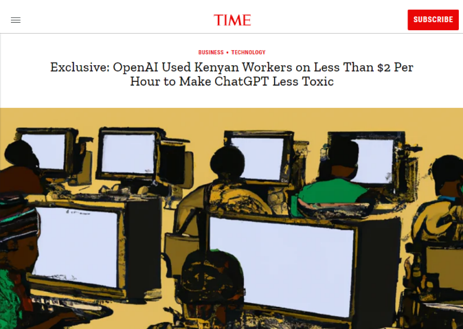 美国《时代周刊》爆出,为了训练ChatGPT,OpenAI雇佣了时薪不到2美元的肯尼亚外包劳工,最低时薪甚至仅1.32美元,折合月薪仅不到200美元。且工作量非常大,被要求每天至少工作9小时,至多标注数万个单词,有员工遭受持久心理创伤。