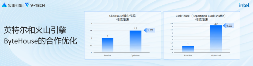 火山引擎与英特尔在云原生大数据领域深入合作,从用户云业务需求出发提升数据价值。从湖仓一体方面,英特尔技术团队和火山引擎技术团队联合对 ClickHouse 软件进行优化,通过对硬件指令等其他的优化,使 ClickHouse 核心代码的性能有了 1.5 倍以上的提升,ClickHouse(Repartition-Block shuffle)性能加速 4.2 倍。