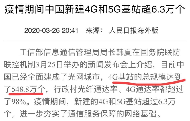 据资料称,2020年,疫情期间,新建的4G和5G基站超过6.3万个,但是如果要算总数的话,5G基站远远不够,因为4G基站的总规模达到了548.8万个,而5G基站只是4G基站的一半。