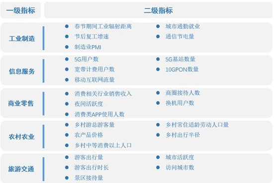 春节经济指数指标体系根据历史行业特征及未来行业发展趋势,保证数据的延续性和前瞻性,聚焦工业制造、信息服务、商业零售、农村农业、旅游交通五大核心产业,面向人口迁徙、基础建设、产业发展等多个维度提炼二十五个细分场景作为二级指标,并根据春节及未来大数据指标发展特征、趋势进行优化调整,采用加权平均法进行测算,完整体现2023春节期间中国经济总体发展水平。