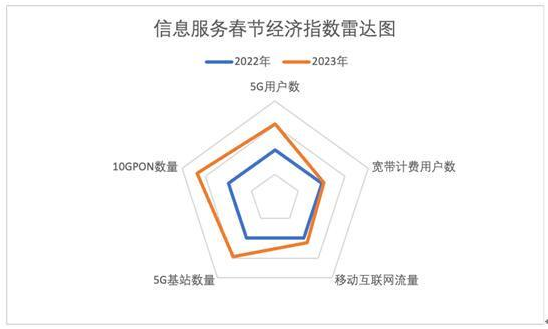 在信息服务应用的活跃度方面,电信5G移动用户春节期间同比去年春节期间净增52.9%,宽带计费用户同比净增5.2%,移动互联网流量同比净增11.2%,其中影音娱乐类流量占比最高。