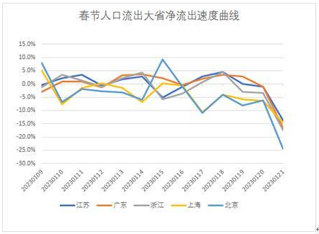 人口迁徙方面,跨省外来务工人员集中的省份,在节前出现了大规模的人员净流出,比如广东、浙江、江苏等沿海经济大省。节前人员净流出最大的5个省 (市),累计流出规模较去年同期增长了14.1%。
